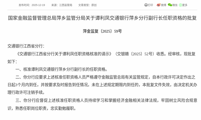2025年12月19日,根据国家金融监督管理总局消息,《交通银行江西省分行关于谭利凤任职资格核准的请示》获得通过,批复谭利凤交通银行萍乡分行副行长的任职资格。