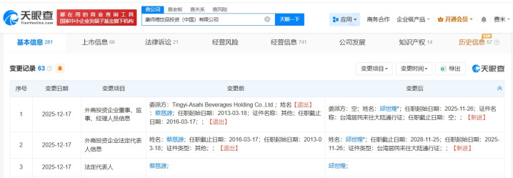 每经AI快讯,天眼查App显示,近日,康师傅饮品投资(中国)有限公司发生工商变更,蔡慈源卸任法定代表人、董事长,由邱世煌接任。该公司成立于2011年5月,注册资本约5.5亿元人民币,经营范围包括在国家允许外商投资的领域依法进行投资,为其母公司、关联公司、所投资企业提供品牌推广、市场营销服务等,由KSFBeverageHoldingCo.,Ltd.全资持股。
